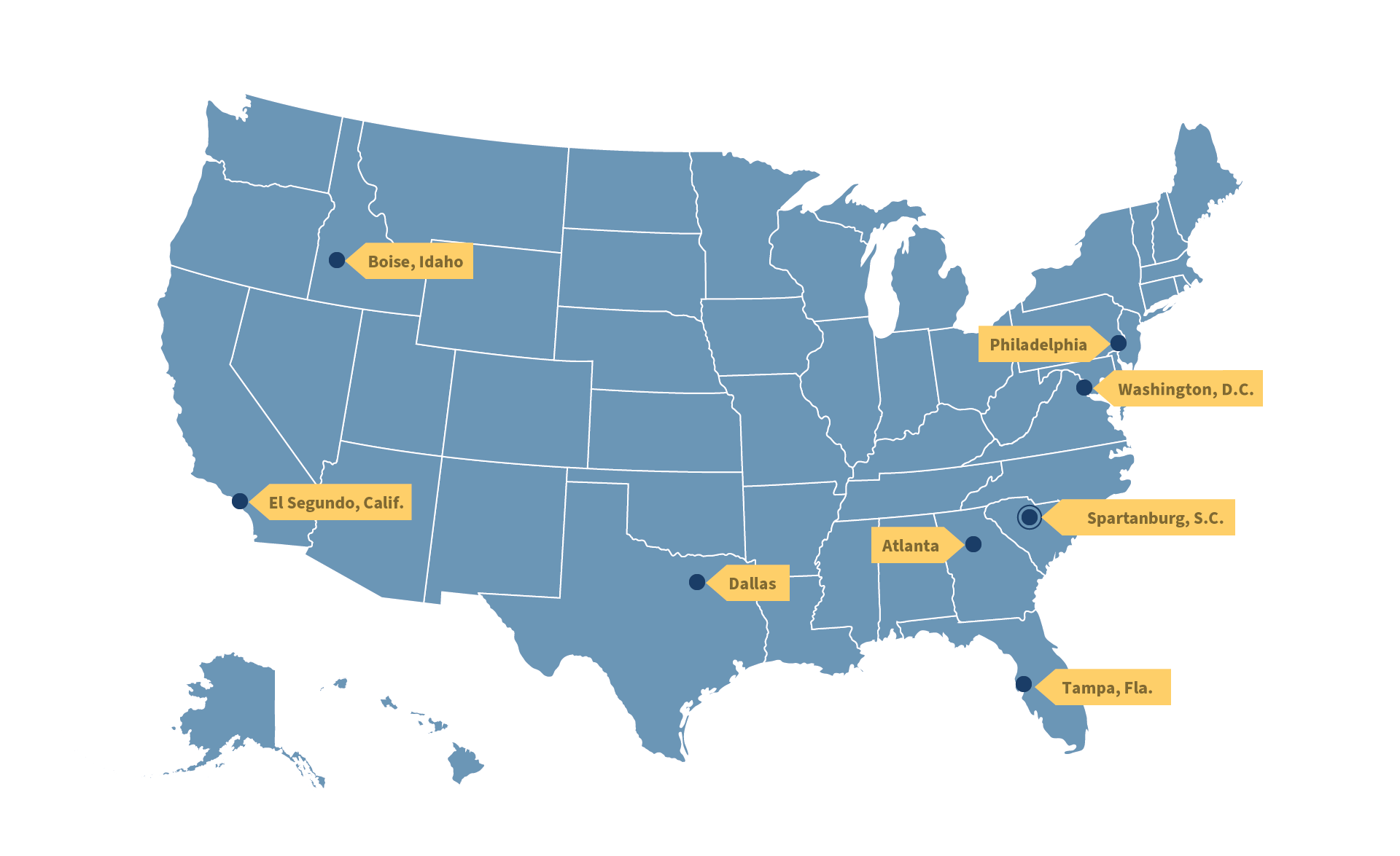 We have eight main offices in major cities across the United States, with headquarters in Spartanburg, S.C. Home to more than 1,000 of our team members, Spartanburg’s thriving economy, ease of living, and wide array of cultural offerings have drawn many corporate headquarters to the city as well as young professionals and families.